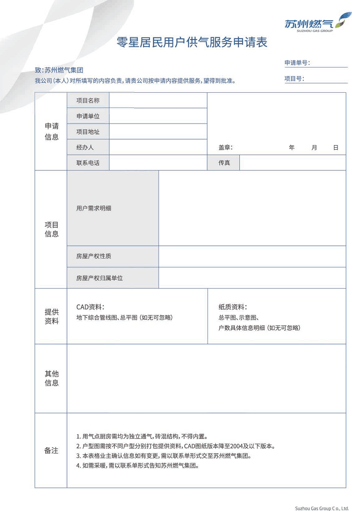 请携带房屋产权证(或公房租赁证)和产权人身份证,至苏州燃气客服中心填写《零星居民用户供气服务申请表》。